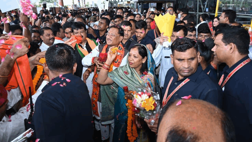 रायपुर, 30 अगस्त 2025/- अपनी आठ दिन के जापान और दक्षिण कोरिया के विदेश दौरे के बाद आज मुख्यमंत्री श्री विष्णु देव साय वापस रायपुर लौटे हैं। श्री साय के वापस लौटने पर आज एयरपोर्ट पर उनका भव्य स्वागत किया गया। छत्तीसगढ़ के पारंपरिक कर्मा और पंथी नृत्यों से पूरा एयरपोर्ट परिसर लगभग एक घंटे तक सराबोर रहा। लोगों की बड़ी संख्या में मौजूदगी ने मुख्यमंत्री श्री साय की लोकप्रियता और उनके विदेश दौरे की सफलता को स्वयं ही बयां कर दिया। मुख्यमंत्री का पुष्प गुच्छों से लेकर गजमाला तक से स्वागत किया गया। एयरपोर्ट के निकास द्वार से मीडिया गैलेरी तक लगभग 100 मीटर की दूरी तय करने में श्री साय को लगभग 15 मिनट लगे। इस दौरान लोगों ने पुष्प वर्षा से भी श्री साय का स्वागत किया। बाद में मुख्यमंत्री ने उपस्थित जनसमुदाय को सम्बोधित किया और इस भव्य स्वागत के लिए सभी का आभार जताया। मुख्यमंत्री ने कहा कि जापान और दक्षिण कोरिया दोनों ही देशों में बड़ा भारतीय समुदाय बसा हुआ है और हमारे छत्तीसगढ़ के लोग भी वहां पर व्यापारिक कार्यों में लगे हुए हैं। उनसे मिलकर मुझे बहुत अच्छा महसूस हुआ और यह लगा ही नहीं कि हम परदेश में हैं। उन्होंने कहा कि हमारे उद्यमी, हमारे कारोबारी पूरी दुनिया में फैले हुए हैं और भारत भूमि का नाम हर तरफ रोशन कर रहे हैं।