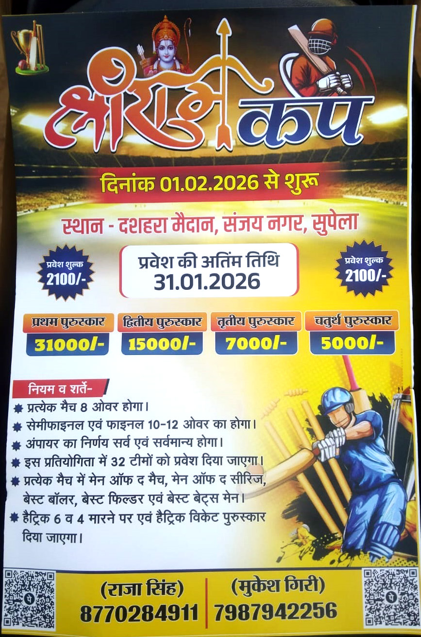 भिलाई। सुपेला के संजय नगर स्थित दशहरा मैदान में श्री राम कप क्रिकेट प्रतियोगिता का आयोजन 1 फरवरी 2026 से किया जा रहा है। इस रोमांचक क्रिकेट टूर्नामेंट में कुल 32 टीमों को प्रवेश दिया जाएगा। प्रतियोगिता को लेकर क्षेत्र के खिलाडिय़ों और खेल प्रेमियों में खासा उत्साह देखा जा रहा है। आयोजकों के अनुसार टूर्नामेंट में भाग लेने के लिए प्रवेश शुल्क 2100 रुपये निर्धारित किया गया है, जबकि प्रवेश की अंतिम तिथि 31 जनवरी 2026 रखी गई है। प्रतियोगिता के सभी लीग मैच 8 ओवर के होंगे, वहीं सेमीफाइनल और फाइनल मुकाबले 10 से 12 ओवर के खेले जाएंगे।